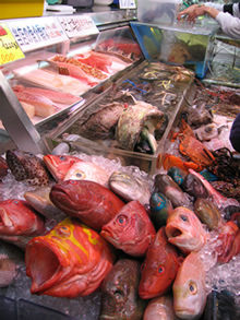 公営市場の魚屋さんをめぐり、活きのいい魚を眺めました。