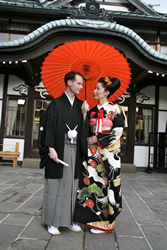 ↑旅館の前で和装にて。